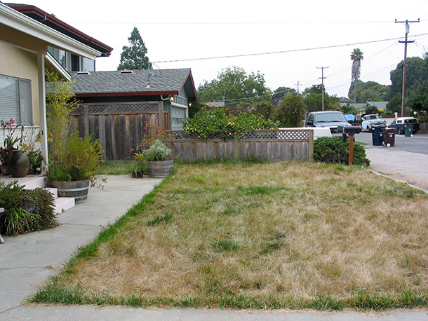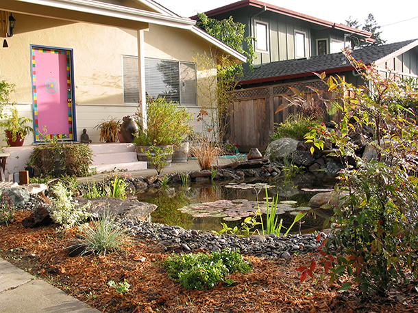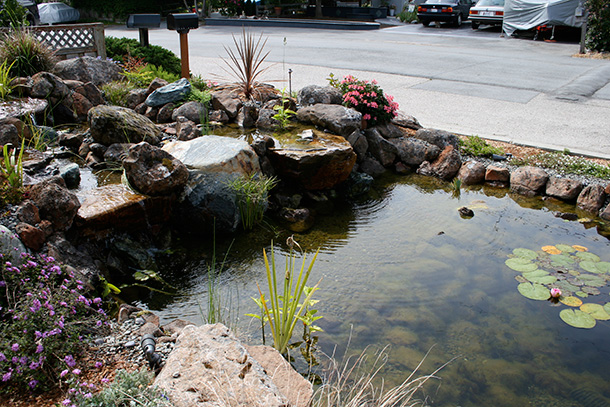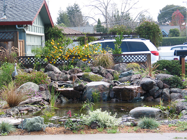 Front yard Pond with waterfall and boulders. Palo Alto. The challenge here was to replace a lawn with a water feature that would completely fill the front yard with accent plants and boulders around the perimeter. The house was next to a park and so had a community aspect to it as people stopped to view it before going into the park.