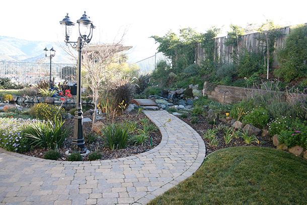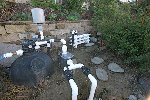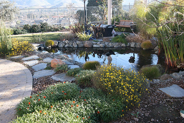 Koi pond with Tse Koi bead filter filtration, Tse Koi UV light, settling tank and pump. This project started with a waterfall falling over a retaining wall and then a stream leading under a bridge to the pond. A paver pathway was later installed that ran through the landscape.