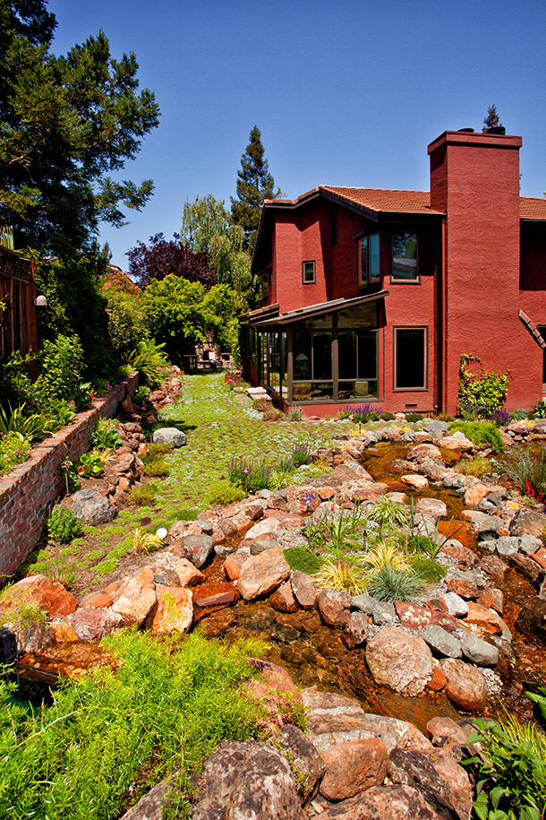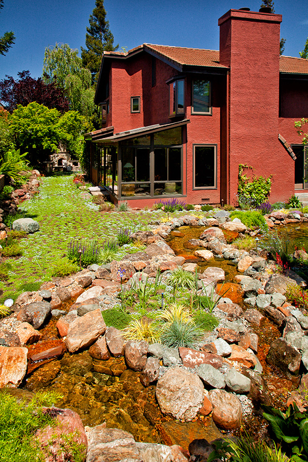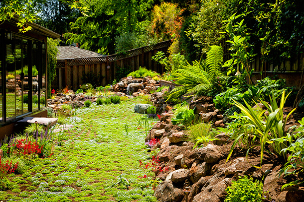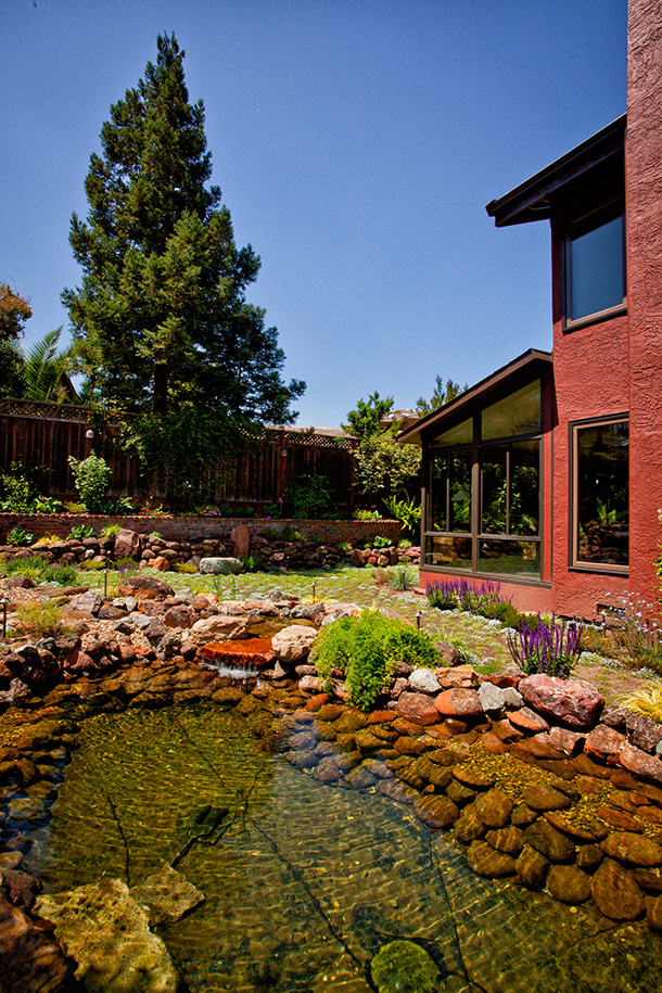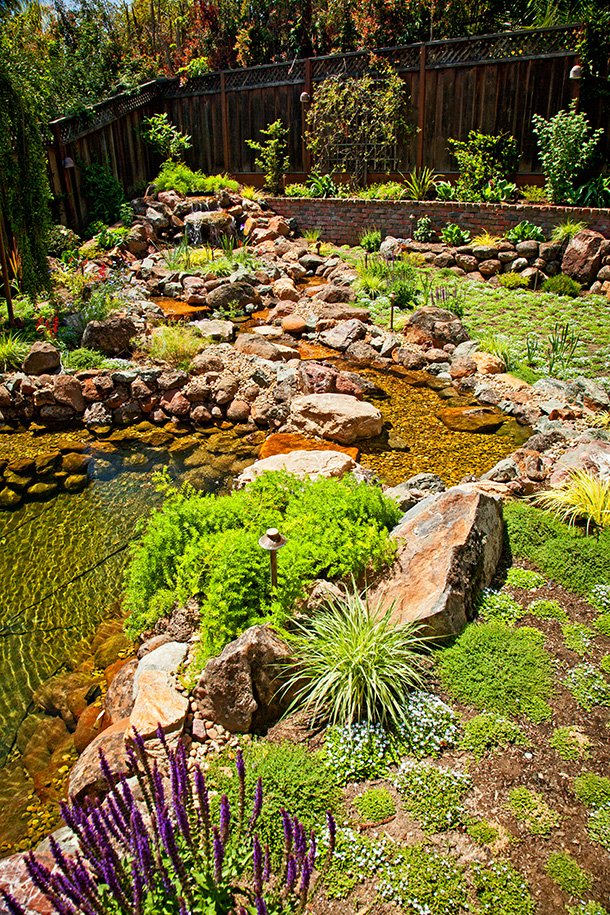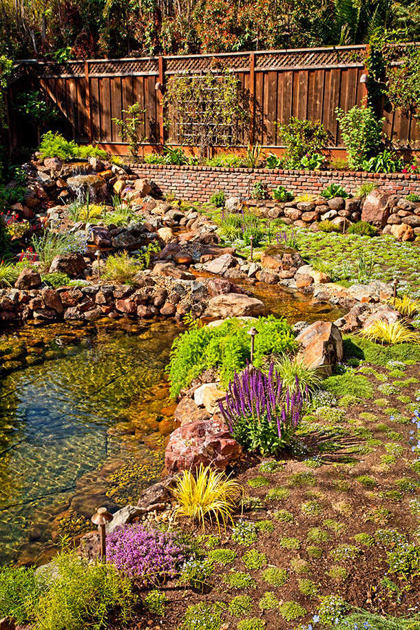 Large landscape installation with koi pond and stream, retaining walls, bamboo hedge with maytan tree, chamomile lawn with flagstone pathway, and night lighting.
